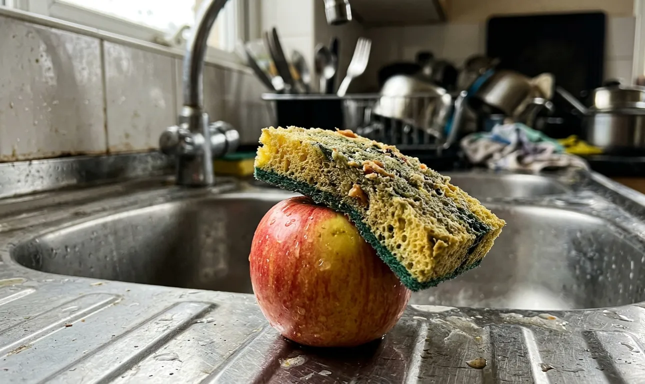 Πολλοί άνθρωποι χρησιμοποιούν κοινά σκεύη από τις καλύτερες προθέσεις, ελπίζοντας να τρίψουν εύκολα την κηρώδη επικάλυψη από τη φλούδα του αγαπημένου τους μήλου ή αχλαδιού. Ωστόσο πορώδης δομή του υλικού λειτουργεί ως ιδανική θερμοκοιτίδα. Σε μια κοινόχρηστη κουζίνα, το σφουγγάρι έρχεται συνεχώς σε επαφή με σάλτσες κρέατος που έχουν περισσέψει, χυμένο γάλα και ζουμί, συγκεντρώνοντας ένα πλούσιο και εντελώς ακατάλληλο περιβάλλον για φρέσκα φρούτα.