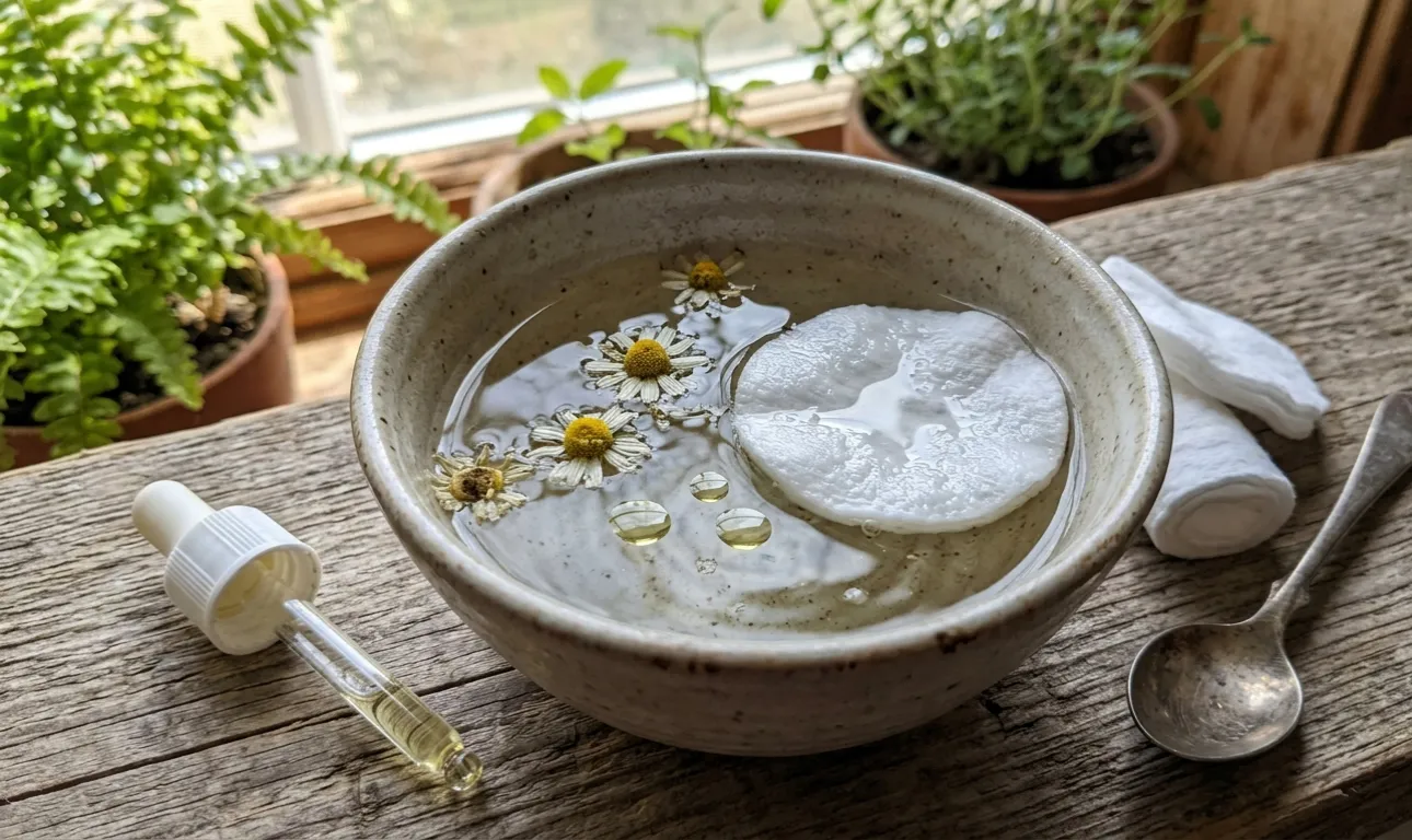 Παρασκευάζετε ένα ισχυρό έγχυμα από άνθη χαμομηλιού για να καταπραΰνετε την περιοχή των βλεφάρων.